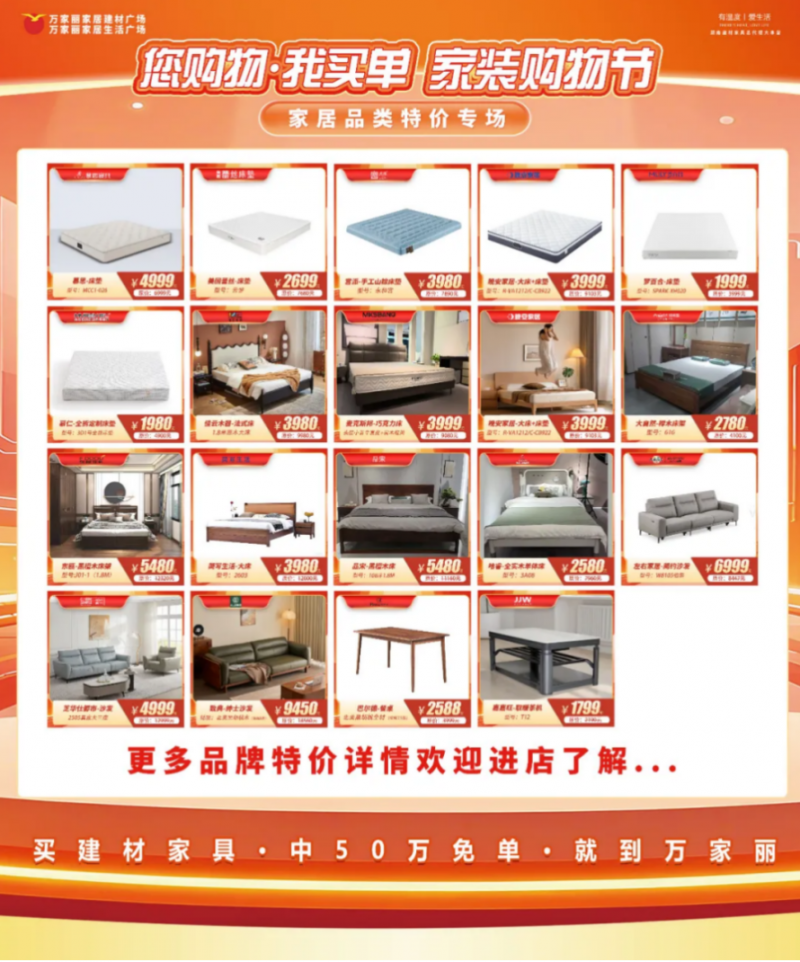 二、家居特价专场,软装焕新特惠 家居品类特价专场涵盖床垫、床架、沙发、餐桌等全系列产品,让消费者省钱焕新品质生活。床垫类中,慕思床垫现价4999元(原价6999元),梦百合、慕仁床垫均优惠超2000元,进口品质与高性价比兼具。床架类的晚安家居大床+床垫组合价3999元(原价9103元),佳云木器法式床热门款式3980元(原价9980元),东瓯黑檀木床架现价5480元(原价12320元),较原价优惠超50%。