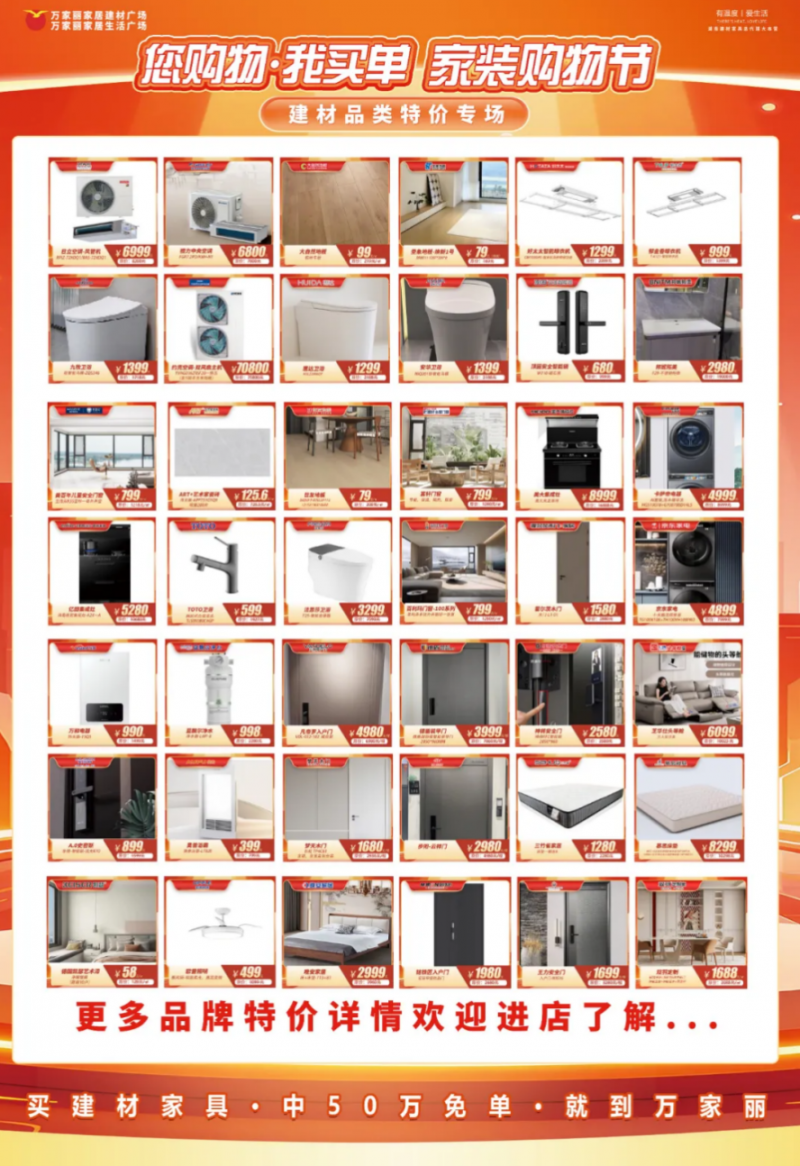 一、建材特价专场,大牌底价直供 作为家装消费的核心阵地,万家丽建材品类特价专场集结全球头部品牌,从基础硬装到智能家电,均以全市最低价回馈消费者。空调暖通类中,格力中央空调现价6800元(原价7800元),奥普浴霸低至399元(原价799元),性价比拉满。地板类的大自然、圣象、世友三大品牌集体放价,最低79元/㎡即可入手,较原价直降近六成,适配各类装修风格。晾衣架类的好太太智能晾衣机1299元(原价2099元)、郁金香晾衣机999元(原价1399元),让智能便捷生活触手可及。