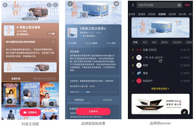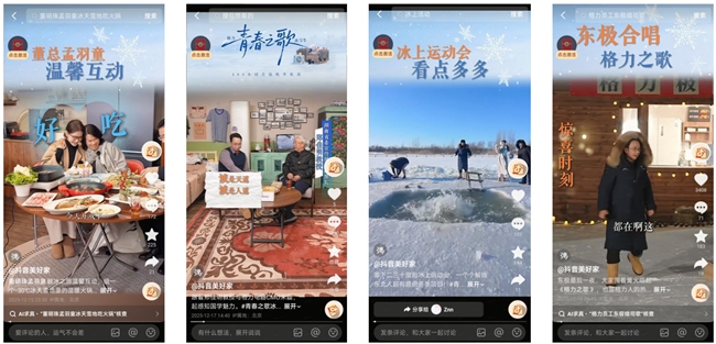 科技守护温暖,格力交出“最硬核”性能答卷 直面极寒,经过各种外部条件检验,格力产品的性能优势反而被无限放大。“青春之歌冰雪季”巧妙地将技术验证融入生动场景,完成了从功能展示到价值传递的升级。直播中最引人注目的演示,莫过于“火凤凰”暖冷一体机的极限挑战。工程师现场拆解,向观众展示了格力自主研发、荣获“广东省科学技术一等奖”的双级增焓压缩机。通过系统性介绍的格力单级压缩机、双级压缩机、三缸双级压缩机的研发历程和产品性能,展示了格力在压缩机领域的核心科技;并通过进一步展示双级增焓压缩机刨面模型,清晰阐释了其如何在-35℃的超低温下依然能强劲制热、智能除霜,成为小屋名副其实的“温暖源头”。 除了空气源热泵产品,格力“全能王”系列挂/柜机的表现同样亮眼。其搭载的国际领先分布式送风技术,通过丝巾飘动的实验,生动证明了“风不吹人”的舒适体验;而-35℃低温制热不停机的技术,则确保了室内外50℃温差下,室内恒温如春。正如朱磊在直播中所言:“即使窗外是零下三十度的冰雪王国,家里依然是脱下外套的春天。”这句话,正是对格力技术最通俗也最有力的诠释。 尽管直播与“温度”紧密相关,但产品展示并未止步于空调,而是构建了一个完整的“温暖生态”。658绒雾米冰箱运用-33℃深冻储鲜技术,加速深冻食材,大幅降低肉类汁液流失率,使东极鱼肉的新鲜营养保持如初;鲸涛净热一体机,将净化与加热功能融为一体,能将室外的雪水净化为可饮用的热水,口感甘甜,没有异味;臻柔洗烘机、北欧时光篝火暖风机等20余款产品各司其职,共同在东极打造了一个舒适、便捷的智慧生活空间,也再度格力强大的科研实力。 重磅资源扶持,构建高能传播全链路 作为巨量引擎联合抖音生活服务,共同为格力量身定制的项目,“青春之歌冰雪季”从项目伊始就获得了站内全方位的资源护航。项目上线专属H5专题页,以主话题#青春之歌冰雪季#发起超级挑战赛,形成了强大的流量聚合效应。同时,品牌榜Banner以及@抖音美好家 官方账号的内容联动,共同构建了一条涵盖“曝光-互动-转化”的完整营销链路。