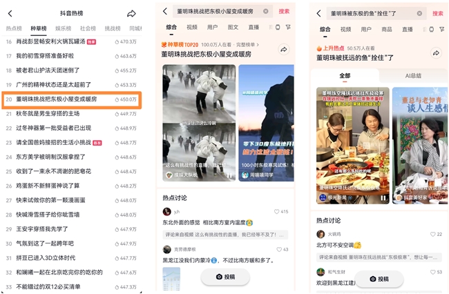 在话题运营上,“青春之歌冰雪季”更是捕捉亮点,精准发力。#董明珠被抚远的鱼“拴住”了#迅速进入抖音上升热点榜,#董明珠挑战把东极小屋变成暖房#位列种草榜TOP20,多个热点话题借助嘉宾互动、产品实测、文化体验等优质内容激发用户自发传播,推动最终项目总曝光突破5亿。更重要的是,以直播、短视频等内容为载体,“青春之歌冰雪季”将格力产品与“极寒生存”、“人文体验”、“青春奋斗”等主题深度绑定,成功在用户心智中牢固植入了格力“中国制造”、“极寒适配专家”的品牌标签,最终实现传播效果与品牌价值的双赢。
